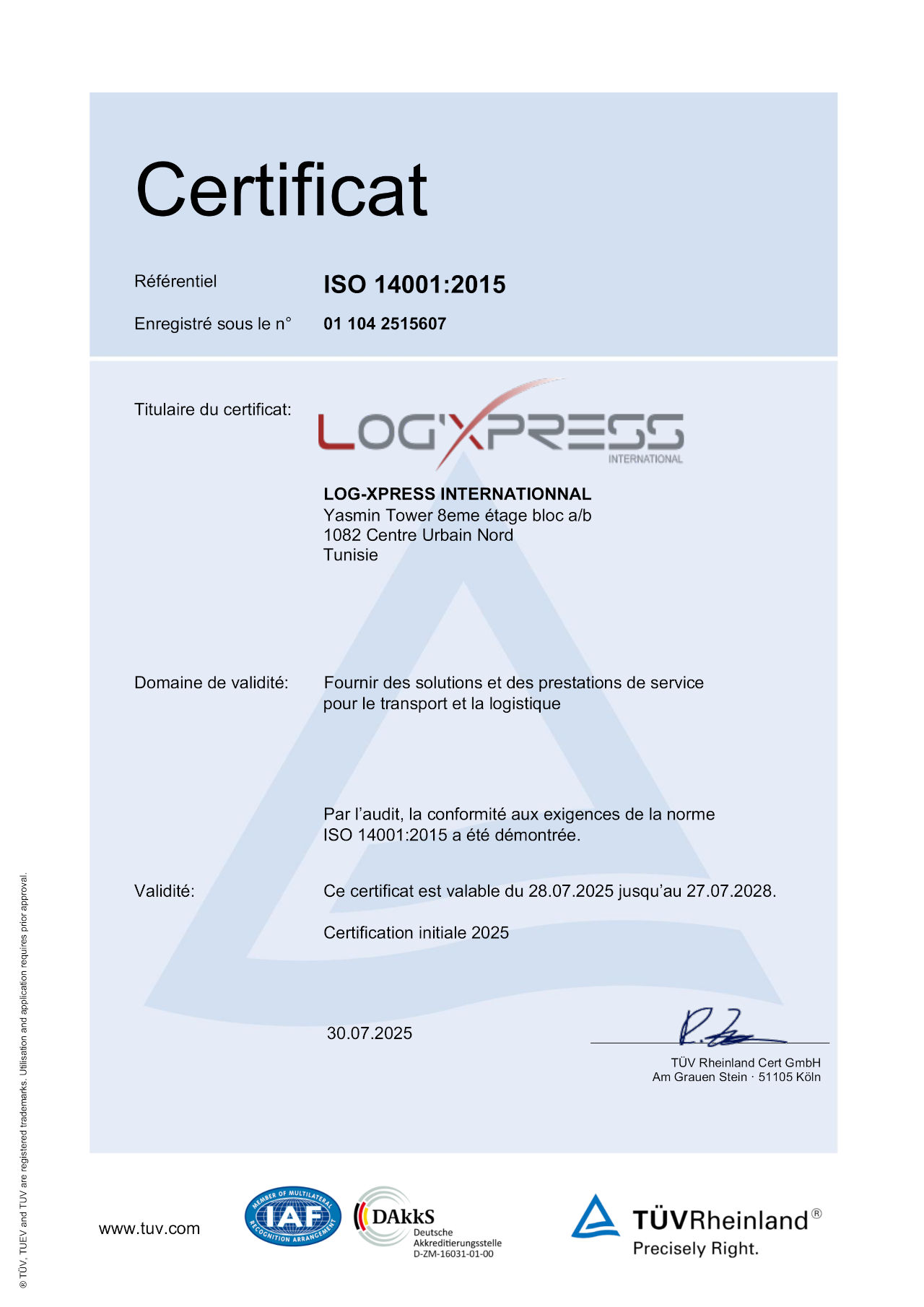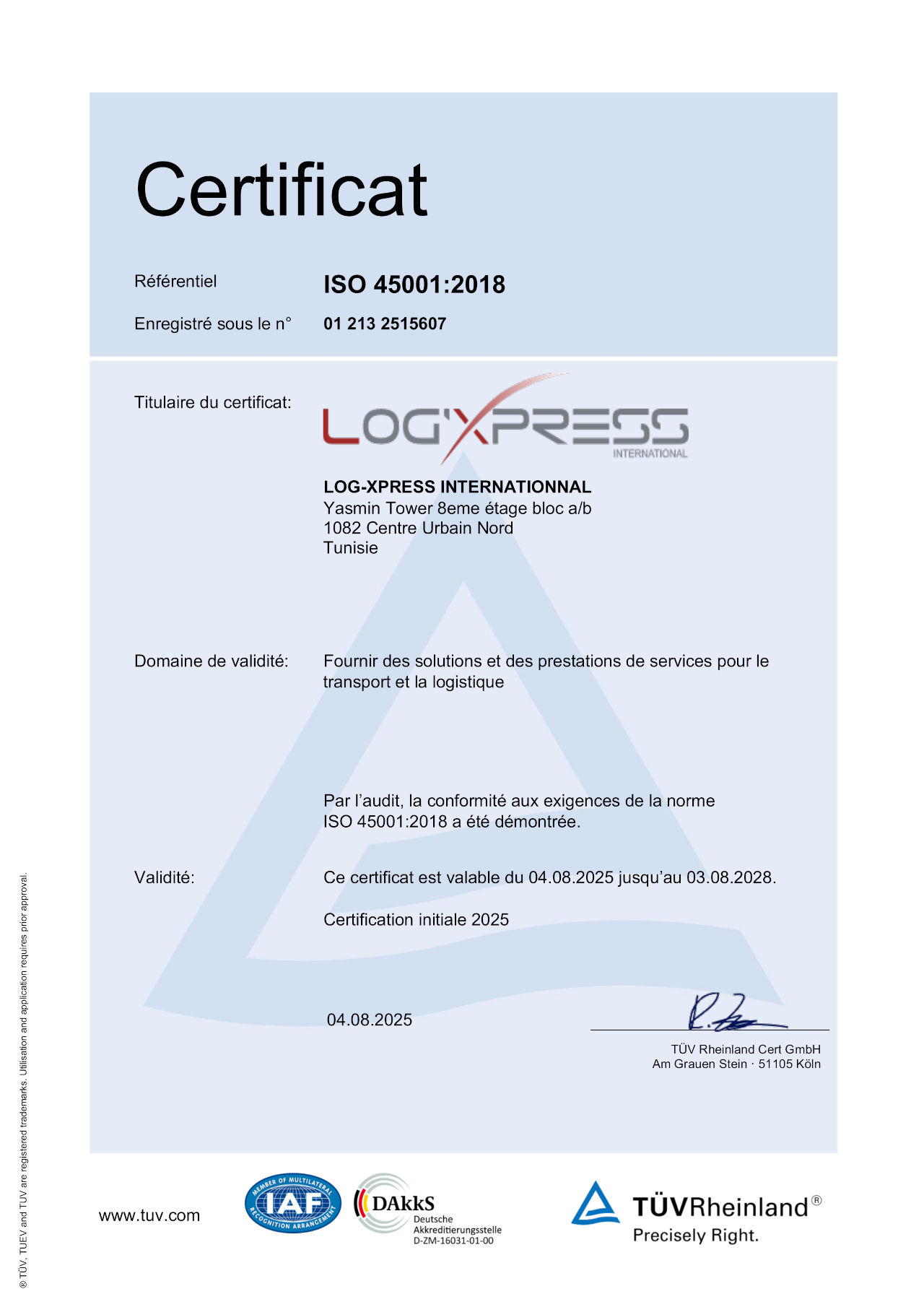 LOG’XPRESS International est certifiée ISO 9001 (Qualité), ISO 14001 (Environnement) et ISO 45001 (Santé et sécurité au travail). Ces certifications attestent de notre engagement à maintenir des standards élevés de performance, de conformité et de sécurité, garantissant à nos clients des services fiables, durables et respectueux des normes internationales. Elles renforcent également notre engagement envers la qualité, la sécurité et la protection de l’environnement à chaque étape de nos opérations.